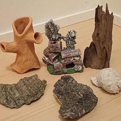Myyn kuvan akvaariossa näkyvät luolakoristeet. Hyvä suoja/piilopaikka esim. Ahvenille/plekoille. Hinta 40€/kpl.