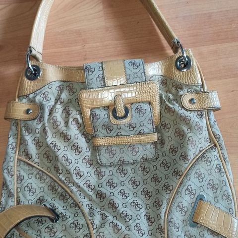 Guess naisten olkalaukku, valmistettu valkoisesta tekonahasta. Laukussa on säädettävä olkahihna, jossa ketjuyksityiskohtia. Sisätilat sisältävät useita lokeroita ja vetoketjutaskun. Laukun pinta on koristeltu Guess-logokuvioinnilla. Todella hyvässä kunnossa. Ainoat moitteet: kuvassa 3 näkyy kannen sisäpinnassa pieni parin millin tahra ja kuvassa 6 näkyy hihnassa tummentumaa siltä kohdin mikä ollut ihoa vasten. Laukun mitat: leveys 19cm ja korkeus 15cm