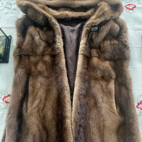 Kaunis, mittojen mukaan teetetty minkkiliivi. (Ei painava). Leveys 57,5 cm ja putuus 68 cm. Koko n. 40-42.