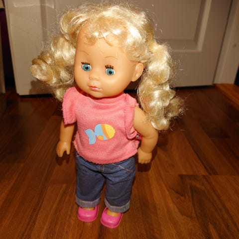 JC Toys nukke. Nukke on pehmeävartaloinen ja sopii hyvin ensinukeksi lapsen leikkeihin. Ikäsuositus 2+. Pituus n. 30 cm. Mukana tutti. Nukke on ehjä, mutta hieman jotain tahraa löytyy. Koitan isommat putsailla pois, mutta tarkempi pesu jää ostajalle.