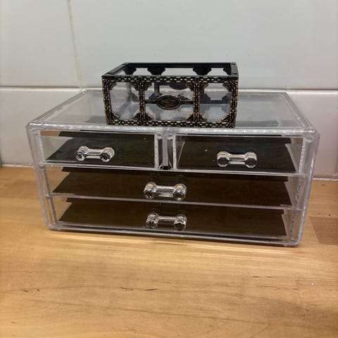 Harmaanvihreä säilytysrasia, jossa molemmille puolille kippaava kansi.