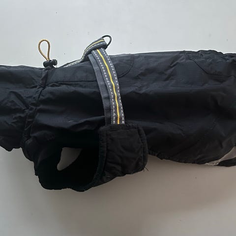 Tästä erittäin lämmin takki. Vähän käytetty kasvavalla pennulla, kaverien naskalihampaat tehneet pari viiltoa takin pintaan (näkyvät kuvissa) eivät vaikuta käyttöön. Takki kestää aikuisten hammastelua ja on yllättävän vahva kangas. Helppo pukea, kaikki muu täysin ehjää. Jalkaremmit pitää takin hyvin suorassa. Hajuton, savuton talous.