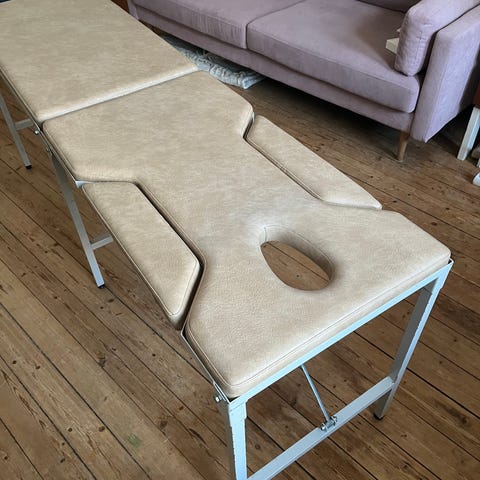 Käytetty hieronta-/ hoitopöytä 50x200. Toimiva, säädettävä ja kohtalaisessa kunnossa