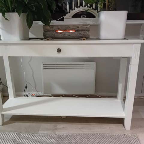 Puinen sivupöytä kolmella laatikolla.Pinnassa vaaleampia kuluneita kohtia,saa peitettyä luultavasti huonekaluöljyllä tai lakalla.Tukeva ja ehjä.