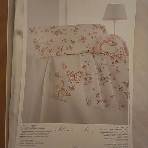 Blumarine-lakanasetti vauvansänkyyn puuvillaperkaalia, jossa on hieno perhoskuvio.