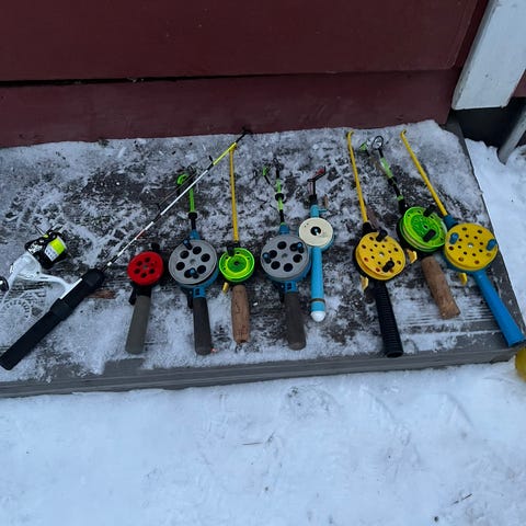 Käyttämätön pilkkisetti jossa siinä on valmiina siima kesällä ja hyyhmäkauha mukaan