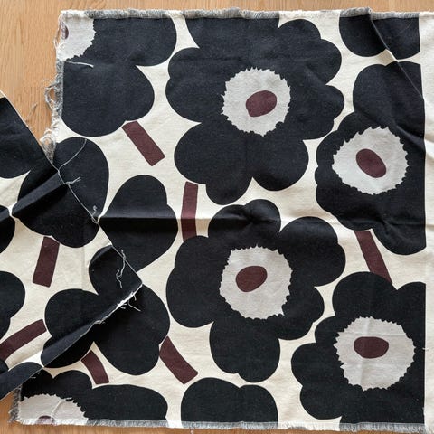 Marimekko unikko kangas, jossa sivuihin ommeltu käänne sekä yhdelle pitkistä sivuista.Kangas on erittäin hyväkuntoinen ja sen pituus on 194 cm, leveys 67 cm.