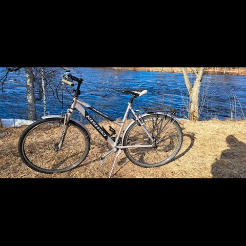 Insera Hybridbike in a good condition with 27 gears and 28” wheels. Disc brakes front and back. Front suspension. Light frame. New handlebars. Fenders, a back reflector and a kickstand included. Basic repairs made. Minor bumps.
