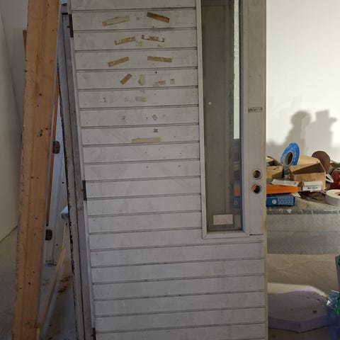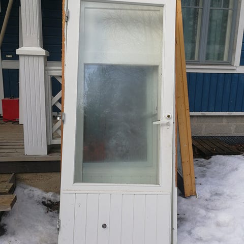 Puinen ulko-ovi 990x2090mm. 3-k eristyslasit. Saranat vaihtaisin itse jos tulisi omaan käyttöön. Lukkorunko, painike ja avainpesä paikallaan, ei avaimia.