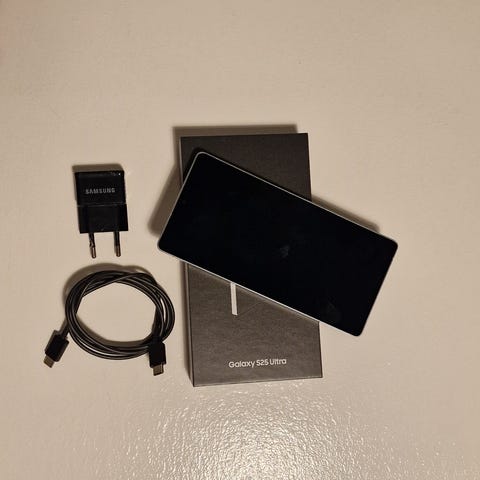 Samsung S25 Ultra -puhelin, USB-C latausjohto, Sim -työkalu, pikaopas, myyntipakkaus, alkuperäinen takuukuitti.