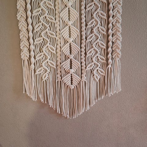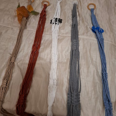 Makramee amppeli punaisena ja valkoisena. Käytetään kasvien ripustamiseen. Materiaali on solmittua narua, värit punainen ja valkoinen.