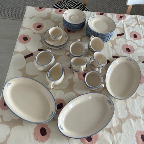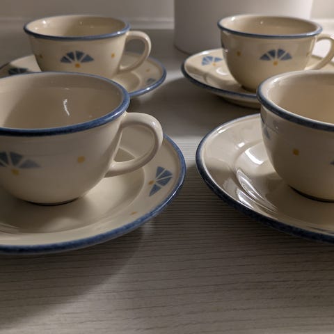 Hyväkuntoiset, kuin uudet Pentik Tapio kahvikupit, joihin kuuluu myös asetit sekä leipälautaset, joita kaikkia on käytetty todella vähän.