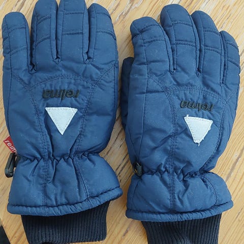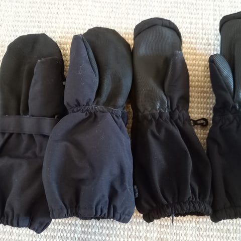 Kahdet Jonathan-merkkiset käsineet. Kuvassa näkyvät keskimmäiset ovat talvikäsineet, koko 4. Toiset samanmerkkiset käsineet sopivat paremmin välikauteen tai alushanskojen kanssa (koko joko 3 tai 4). Nahkakäsineet saa kaupan päälle (Thinsulate, 5).