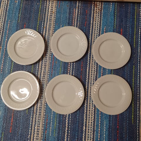 Arabian Inga-Liisa-syvälautanen, jossa on "Pikkuruusu"-koriste. II laatu, kuvio on haalistunut mutta itse lautaset ovat hyvässä kunnossa. Lautasia on 6kpl. Halkaisija on 25cm.
