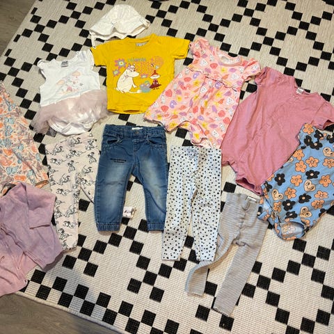 Siistejä, puhtaita ja ehjiä 80-koon vaatteita. 3xpyjama, (Lindex, Peuhu ja Uniqlo), 2xbody (name it ja Newbie), Mekko (kerran käytetty Ciraf), 9xhousut (4xName it, Gugguu pienellä sauman langanpurkautumana, Ciraf, H&M, Molo, Aarrekid).