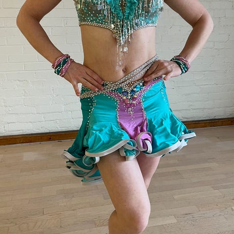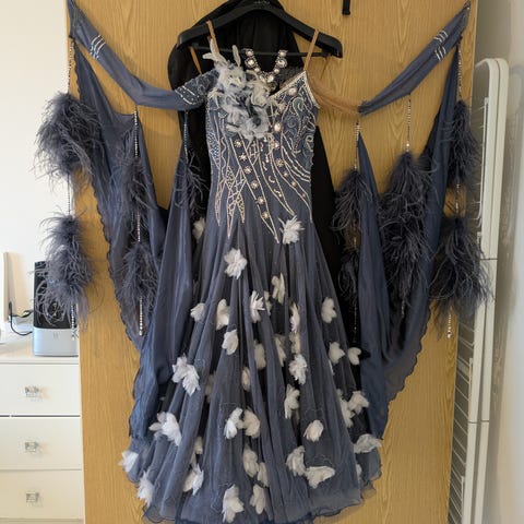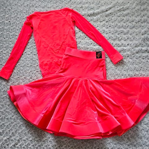 Kaunis punainen kilpatanssi lattarimekko, koko 36-38. Koristeltu Swarovskin strassein, kolmen eri sävyin. Mekkoon kuuluu kaulakoru, kaksi erilaista käsikorua ja pitkät mesh-hansikkaat (kuva). Hansikkaiden yläreunan silikoninauha hapertunut ajan saatossa ja joutuu uusimaan.