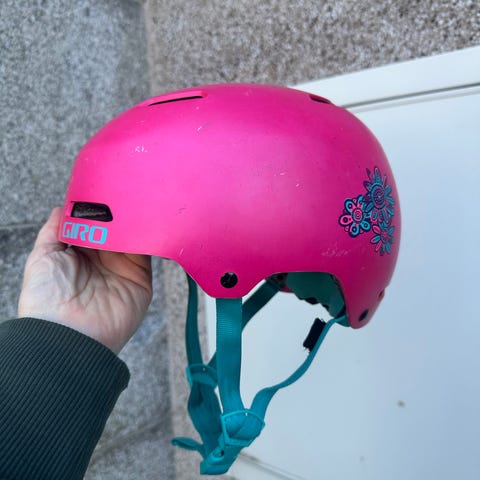 Naisten mukava Bern pyöräilykypärä M-kokoisena. Kypärä ei ole kokenut varsinaisia kolauksia/kovia iskuja ja ollut käytössä lähinnä kevyessä kaupunkipyöräilyssä. Kypärän pinnalla on kuitenkin kulumaa, naarmuja ja käytönjälkiä mikä ei vaikuta muutoin kuin ulkonäköön (katso kuvat).