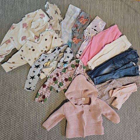 Käytettyjä, mutta yhä siistejä, puhtaita ja reiättömiä vaatteita. 2xhousut (H&M ja Kappahl), 2xhuppari (babyGap ja Tu), Puuvillaneule (H&M), trikoopaita (Mainio) ja 3xbody (Metsola, Lindex (sininen body, jossa ainoa moite käyttöön vaikuttamaton repeämä nepparilistassa) ja Vimma).