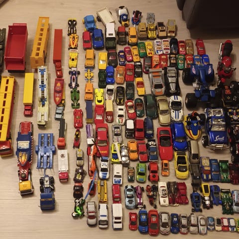 Muuton alta läjä pikkuautoja. Jotain muita leluja seassa. Ei ole uusia on leikitty