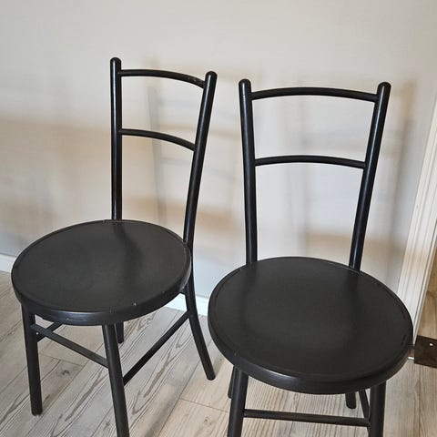Kaksi kunnostusta vaativaa vanhaa, 1900-luvun alun tuolia. Toinen rikki kuvan osoittamalla tavalla. Vanerisen istuinosan alapuolella 100-vuotiaan äitini kirjoittamaa tietoa tuolien historiasta. Ovat 1800-luvulla syntyneiden isovanhempieni hankkimat. Vain noudettuna, maksu MobilePay tai käteinen.