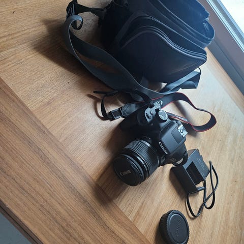 Hyväkuntoinen Canon EOS 1100D järjestelmäkamera ja EFS 18-55mm objektiivi. Kamerassa on digitaalinen näyttö. Mukana kantohihna. Akku kuuluu pakettiin, mutta laturi ei.