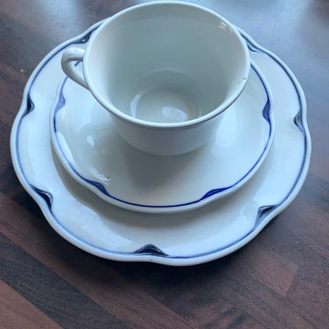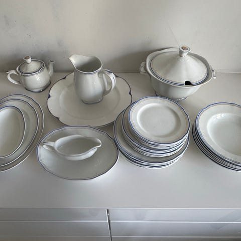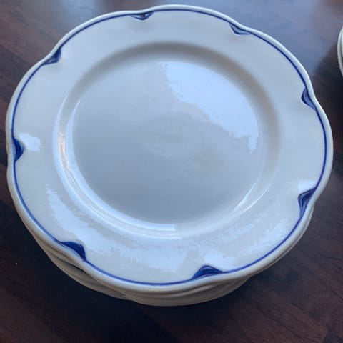Arabia Pekka lautanen, posliinia. Lautanen on valkoinen, jossa sininen reunakuvio. Kuusi kappaletta, pohjassa Pekka-leima