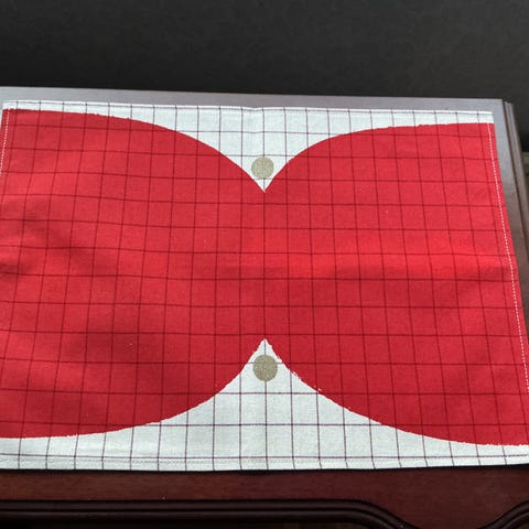 Marimekon punaiset Kalendi-ruutukuosiset pöytätabletit 100% puuvillaa (55% kierrätettyä).