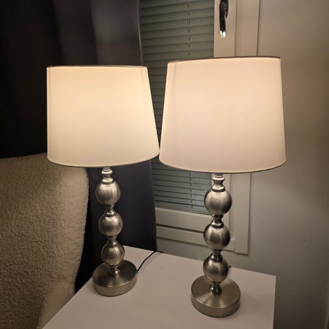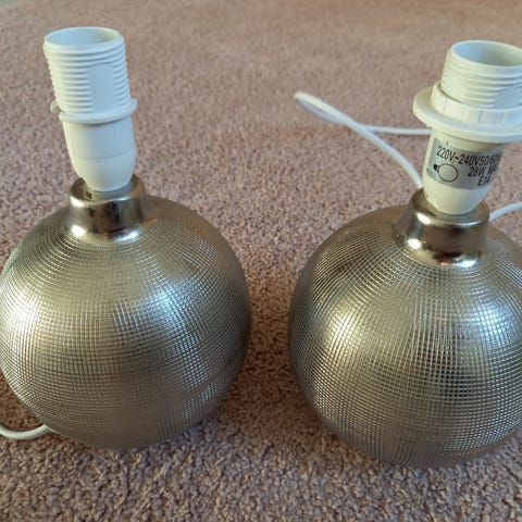 Kaksi valkoista sienenmallista, metallista valaisinta. Korkeus 40cm. Hinta 35€/kpl.
