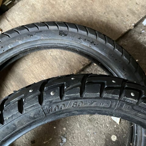 Michelin nastarenkaat, koko 130/70-17 ja 100/80-17. Renkaat on varustettu nastoilla, jotka parantavat pitoa talviolosuhteissa. Sopivat moottoripyöriin.