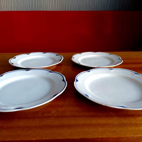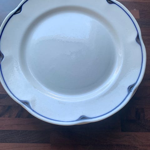 Arabia Pekka lautaset, 7 kappaletta. Valkoinen posliini, sinisellä reunakoristeella. Lautaset soveltuvat ruokailuun ja kattaukseen.