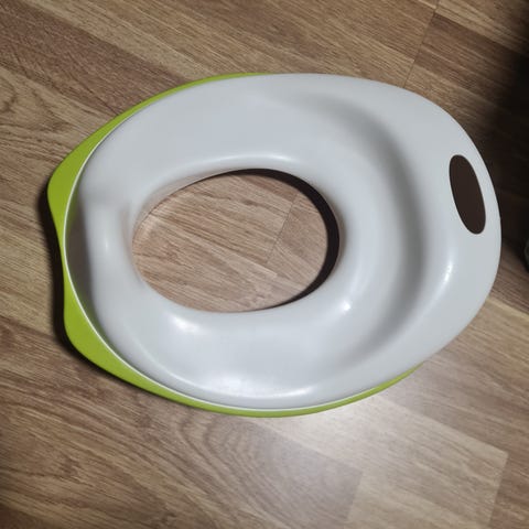 Lasten pottaistuin sinisessä värissä, suunniteltu helpottamaan lasten wc-käyttöä. Istuin on muovimateriaalia ja sopii tavalliseen wc-istuimeen kiinnitettäväksi.
