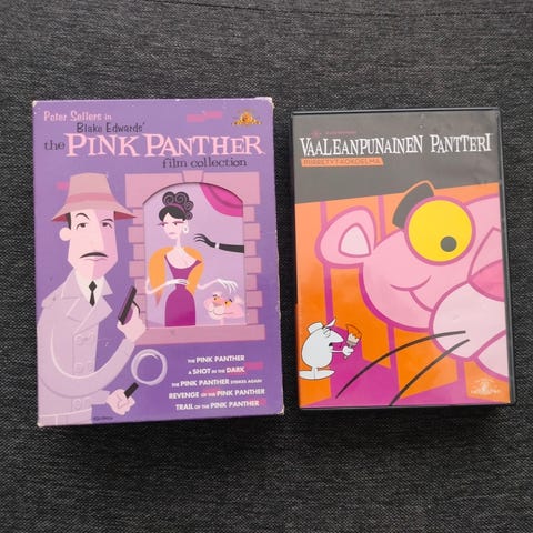 Pink Panther DVD-kokoelma sisältää elokuvat: The Pink Panther, A Shot in the Dark, The Pink Panther Strikes Again, Revenge of the Pink Panther ja Trail of the Pink Panther. Kokoelma on suomenkielinen ja sisältää useita elokuvia vaaleanpunaisesta pantterista.