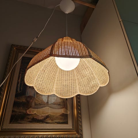 Kaunis vanha kattovalaisin. Mustaa rottinkia ja lasia, ketju metallia. Halkaisija noin 50-60cm.