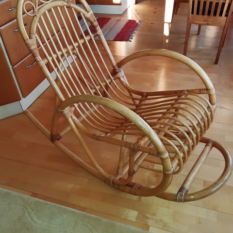 Iso ja mukava lepotuoli rottinkia, sopii hyvin tv:n katseluun tai vaikka päiväunille 😉. Istuimen leveys on halkaisijaltaan 110 cm, korkeus määrittyy sen mukaan, mihin asentoon istuimen jalkaosaan laittaa. Istuimen pehmuste on itse tehty, tarvittaessa sen voi tilata esim. Jyskistä, jos haluaa tehdasvalmisteisen. Vain nouto Kivisalmi Lpr.
