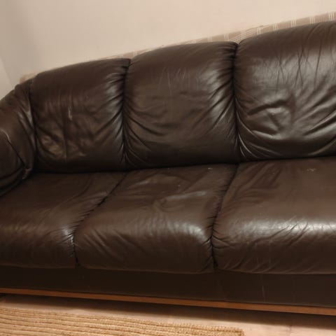 Siisti nahkasohva, etukulmassa kuvassa näkyy pientä käytön jälkeä. Muuten tosi siisti.