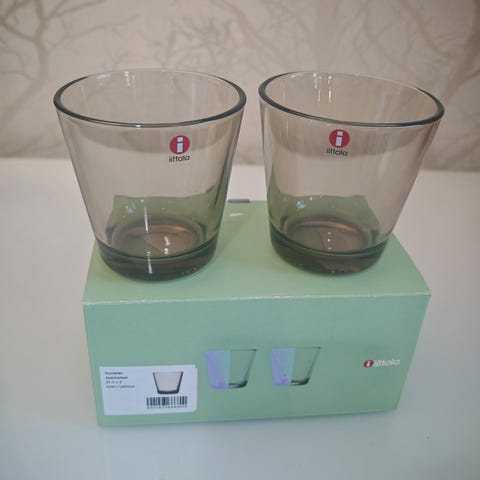 Kaj Franckin suunnittelemassa lasissa korkeus on 8 cm ja leveys 8 cm. Kirkkaassa lasissa on iittala-tarra. Vedensiniseksi määritellystä väristä en ole aivan varma, saattaa olla jotain muutakin, esimerkiksi turkoosi. Lähinnä olleet astiahyllyssä näytillä, joten käyttö on ollut minimalista.