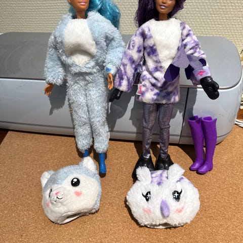 Paljon leikityt nuket, jotka edelleen siistissä kunnossa. Barbie ”suorajalkainen” mutta toisen nuken jalat taittuvat hieman samoin kun alkuperäiset ”timantti”-korvakorut & sormus tallessa. Näille nukeille en löytänyt kenkiä.