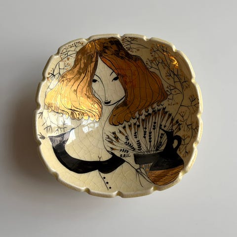 Raija Rauanheimo-Kojosen pieni, keraaminen seinälautanen, ripustus + Falco- teksti takana, halk 7cm, kork 3cm, pohjassa tummentuma lasitteesta