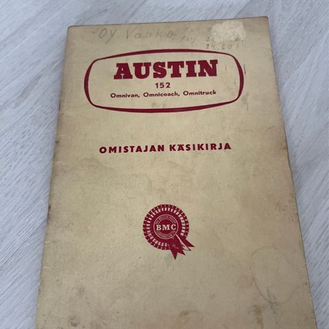 Kuvien vanha Austin "omistajan opas" vuodelta 1958. Lisäksi vielä takuutodistus.