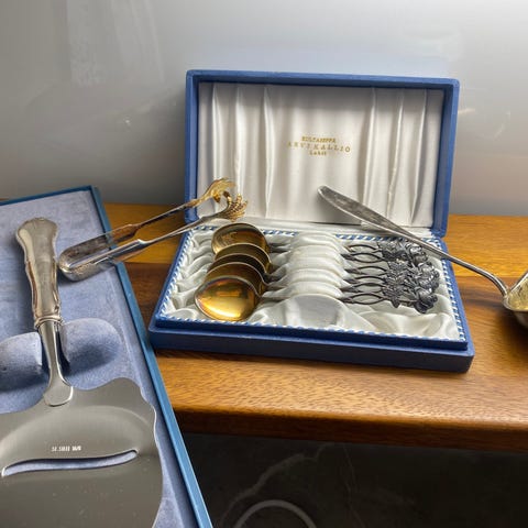 Kuvan hopea aterimet, 5 kpl. Rasia mukaan. Osassa kaiverruksia.