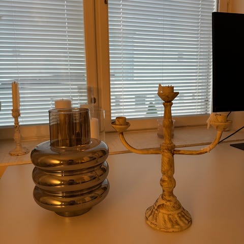 28 cm korkea shampanjapullo jota köytetty kynttilänjalkana.