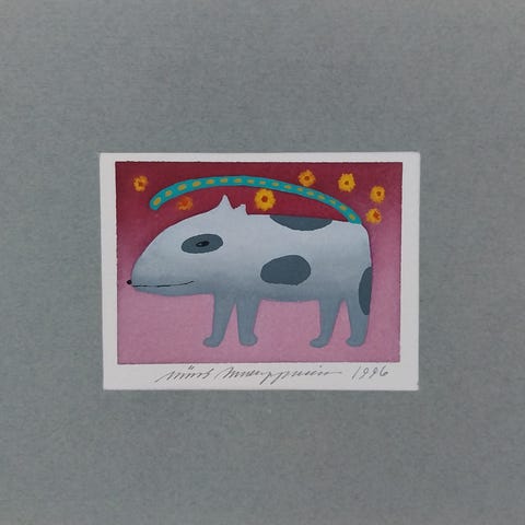 Myydään Viivi Kemppaisen sympaattinen akvarelli vuodelta 1996 kehystettynä. Kehyksessä aivan hivenen kulumaa, mutta yleisvaikutelma erinomainen. Akvarellin koko noin 14 x 14 cm. Kehyksen koko noin 25 x 30 cm.
