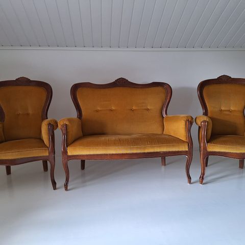 Hieno Rokokoo sohva ja kaksi tuolia.