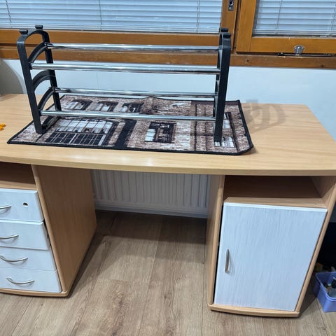 Puinen työpöytä, jossa on pyörät helppoa siirtelyä varten. Pöytä on vaaleaa puuta ja sopii erilaisiin työ- tai kotitoimistoympäristöihin. Tarvittaessa voidaan avustaa kuljetuksessa bensakuluja vastaan