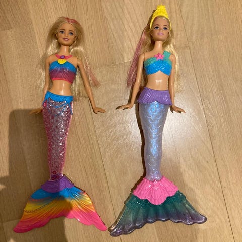 Paljon leikityt Barbie nuket merenneito -tarvikkeineen + matkalaukku. Tästä en ole varma onko Barbie mutta ollut leikeissä mukana. Nuket ovat ns. ”suorajalkaisia”, nivelet ei taitu. Siniselle nukelle en löytänyt sopivia kenkiä.