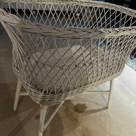Hyväkuntoinen rottinkinen ensisänky pyörillä. Mitat: 52cm x 90cm.