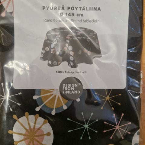 Uudenveroinen, täysin käyttämätön, alkuperäisessä pussissa pidetty Finlaysonin turkoosin värinen pyöreä pöytäliina Kaari. Pöytäliinan halkaisija on 145 cm. Pöytäliina on 100 % puuvillaa, pesu 60 asteessa.