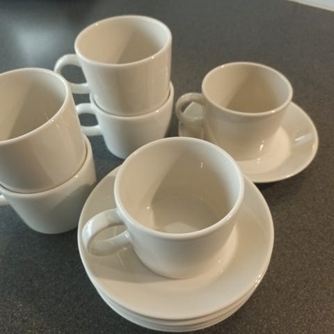 Kaikki kuvassa näkyvät astiat ovat ehyitä, jos joltain puuttuu asetti tai kuppi, niin tästä voi löytyä.