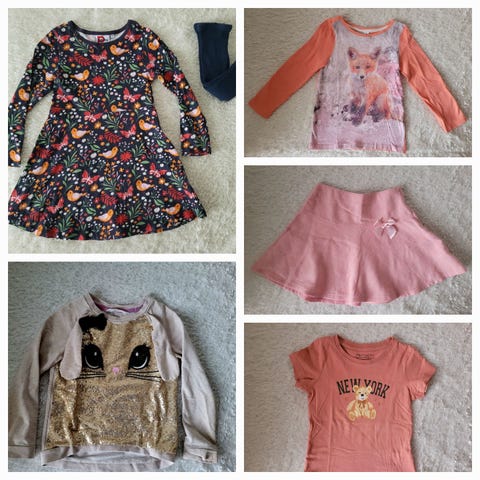 Suloinen koirahuppari, collegetunika koiranpentujen kuvilla, h&m perus trikoopaita ja me&i ihana lintumekko. Kaikki miellyttävää ja joustavaa puuvillaa. Samaan pakettiin mahtuu muutakin.