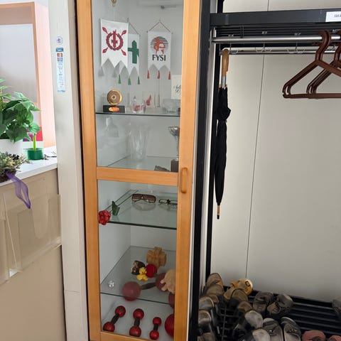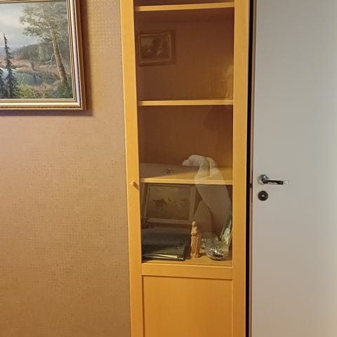 Vitriini lasiovella ja lasihyllyillä. Ei kuljetusta.